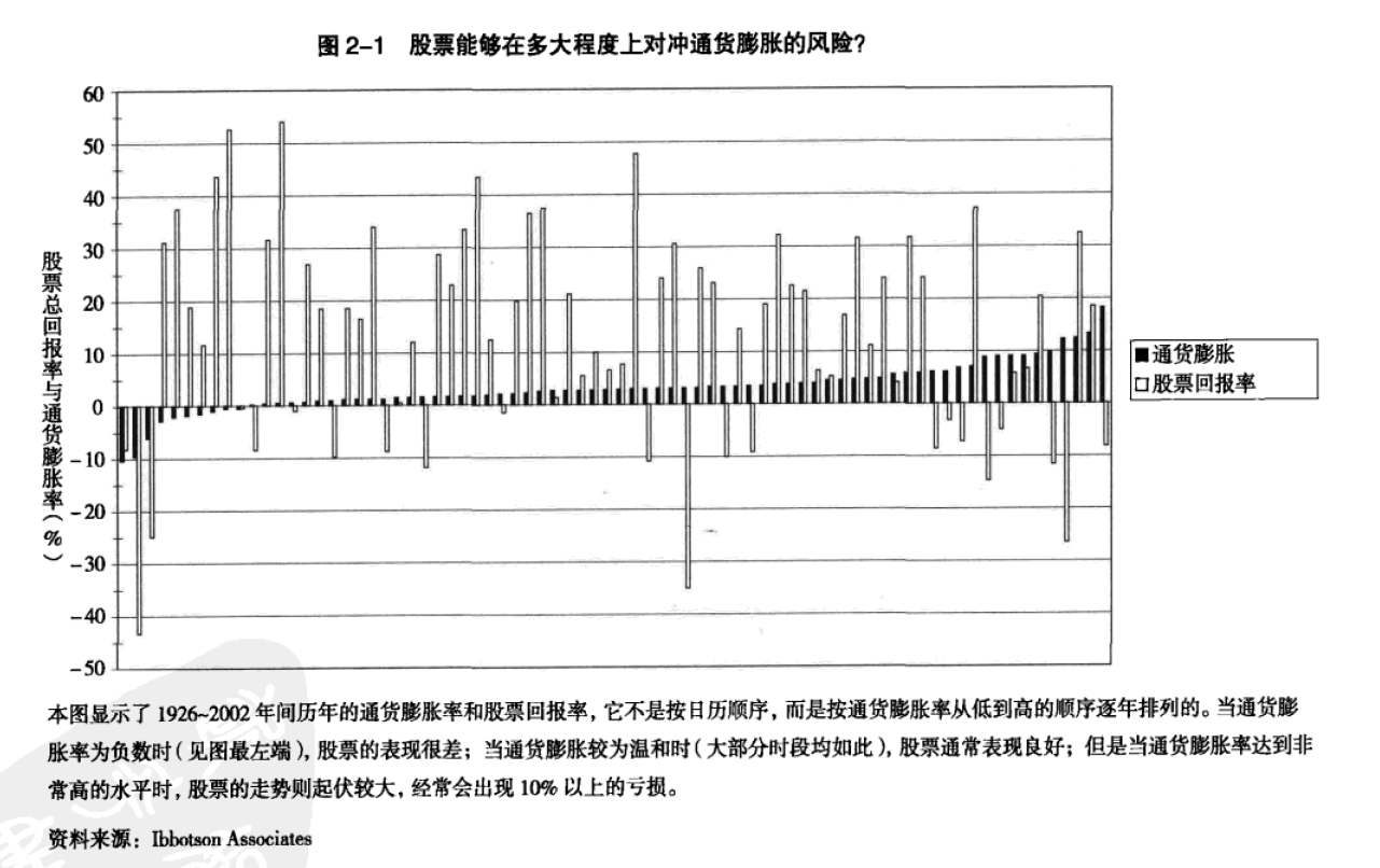 股票以外的抗通膨方法: 1935~1972,公開市場上的黃金價格從每盎司35美元漲到1972年初的48美元,漲幅僅有35%,但在此其間,黃金的持有者並沒有獲得任何資本利得,反而每年要為此付出一些儲存費用。(存銀行生息的收益顯然比持有黃金更好, 從2004年5月以來黃金從每盎司386美元,漲到2011年8月的1900美元,市場是無法預測,且黃金似乎無明顯週期, 無法預估風險)