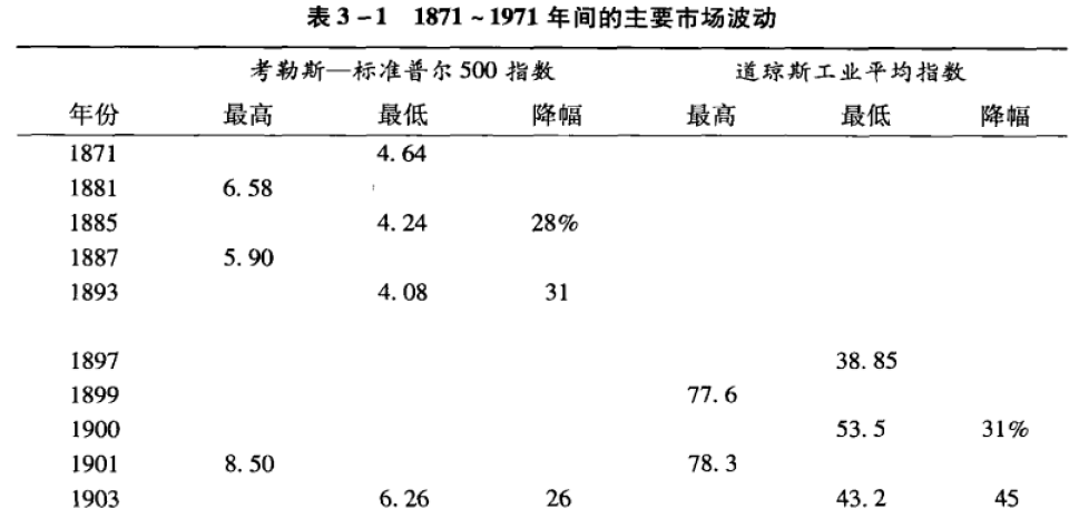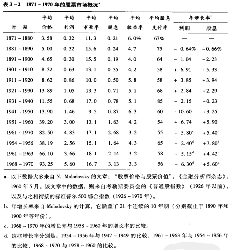 為了對過去100年的股票經濟有全面的認識,除了股價走勢之外,還必須了解相應的獲利與股息情況。表3-2顯示的是1871~1970年的股市概況。