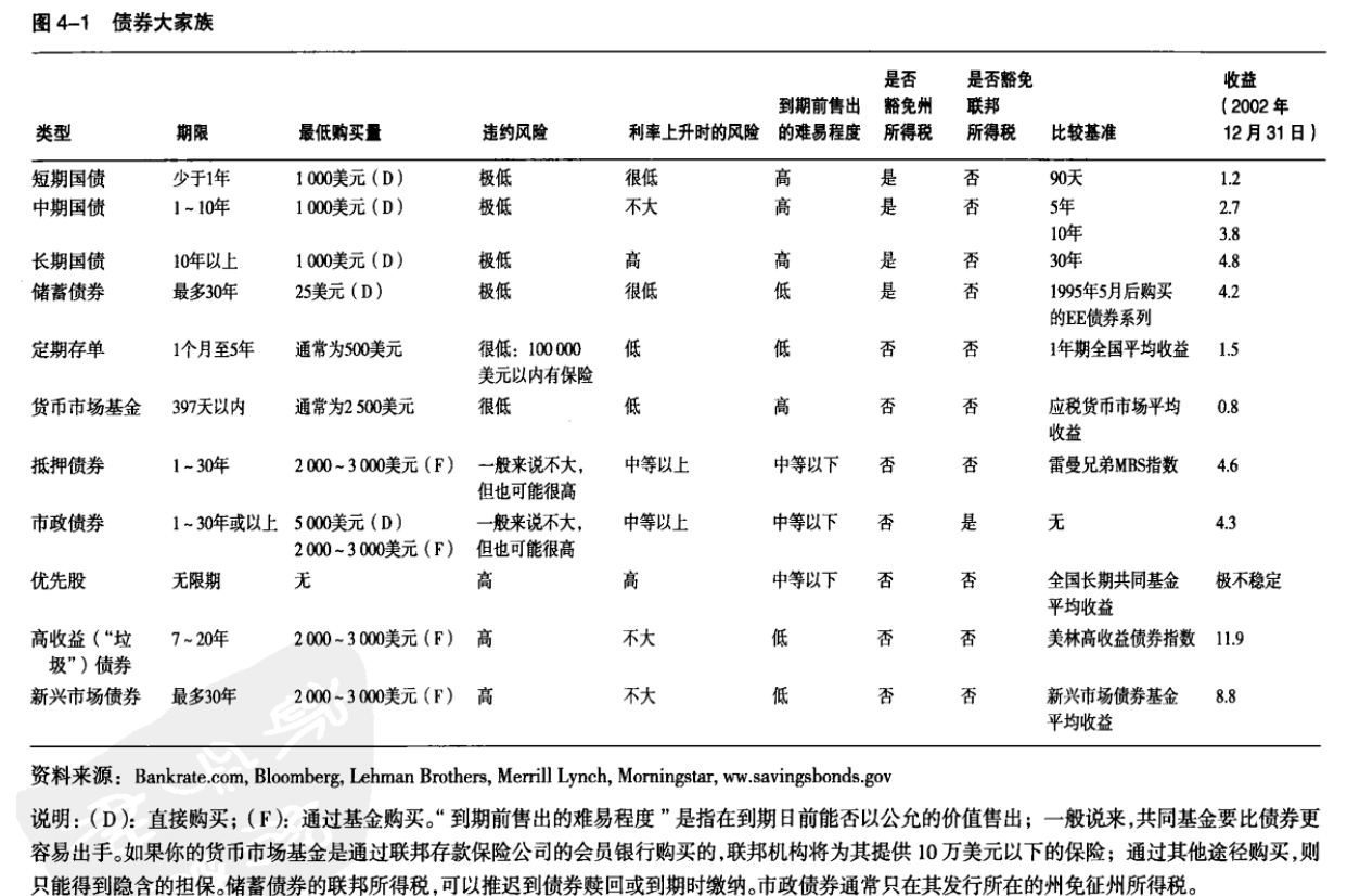 抵押貸款債券: 它是匯集全美數千種抵押貸款所發行的證券,其發行機構如美國聯邦國民抵押貸款協會」(簡稱房利美),或「美國聯邦住宅貸款抵押公司」(簡稱房地美)。然而,它們並沒有美國貼政部的擔保,因而利率訂得較高,以反映其較高的風險。(2008年9月9日,兩房被美國政府接管,以免房地產危險引發「金融體係崩潰」。(Baron: 但仍然造成金融海嘯,至少FED的資產負債表剛低於4兆,2008年時只有9000億。印鈔票終究會帶來通膨?)