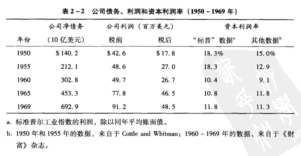 不過,我們必須在此說明一下該表所未揭露的一個問題。1970年,美國企業的整體獲利出現了明顯的惡化,其投資資本獲利率下降到第二次世界大戰以來的最低水準。(Baron 補充: 1970年代石油危機爆發,CPI由6%一路上漲至12%,聯準會的連番升息以控制通膨,造成美國的停滯性通膨,GDP也出現了衰退。1980年代的第二次石油危機,雷根總統實施了較為強勢的美元政策,試圖壓制通膨高漲的情況,當時(1981年)的通膨率一度來到13.5%,在大幅調升聯邦基準利率至21.5%的史上高檔後,通膨隨即受到有效的抑制,但同樣的代價也是美國經濟再度出現衰退。在面對這兩次的經濟衰退時,聯準會的態度皆是以壓制通膨為主,儘管景氣出現了下滑,仍然調升目標聯邦基準利率水準,讓物價回到較穩定的水平。當時的聯準會主席分別為Arthur F. Burns以及Paul A. Volcker(前者為Alan Greenspan的老師)。 但這樣的高利政策也受到當時不小的質疑聲浪,包括需要大量資金借貸來作為周轉的產業,包括:營建業、農業,都受到很大的挑戰。美國失業率也一度來到10%的高檔。)