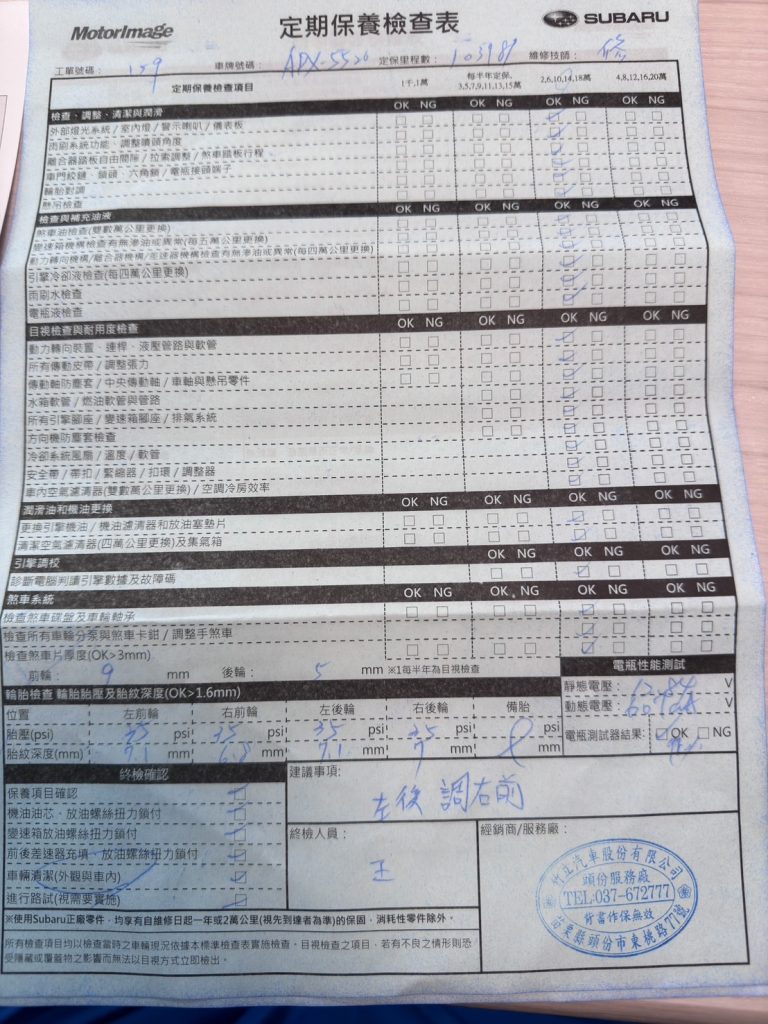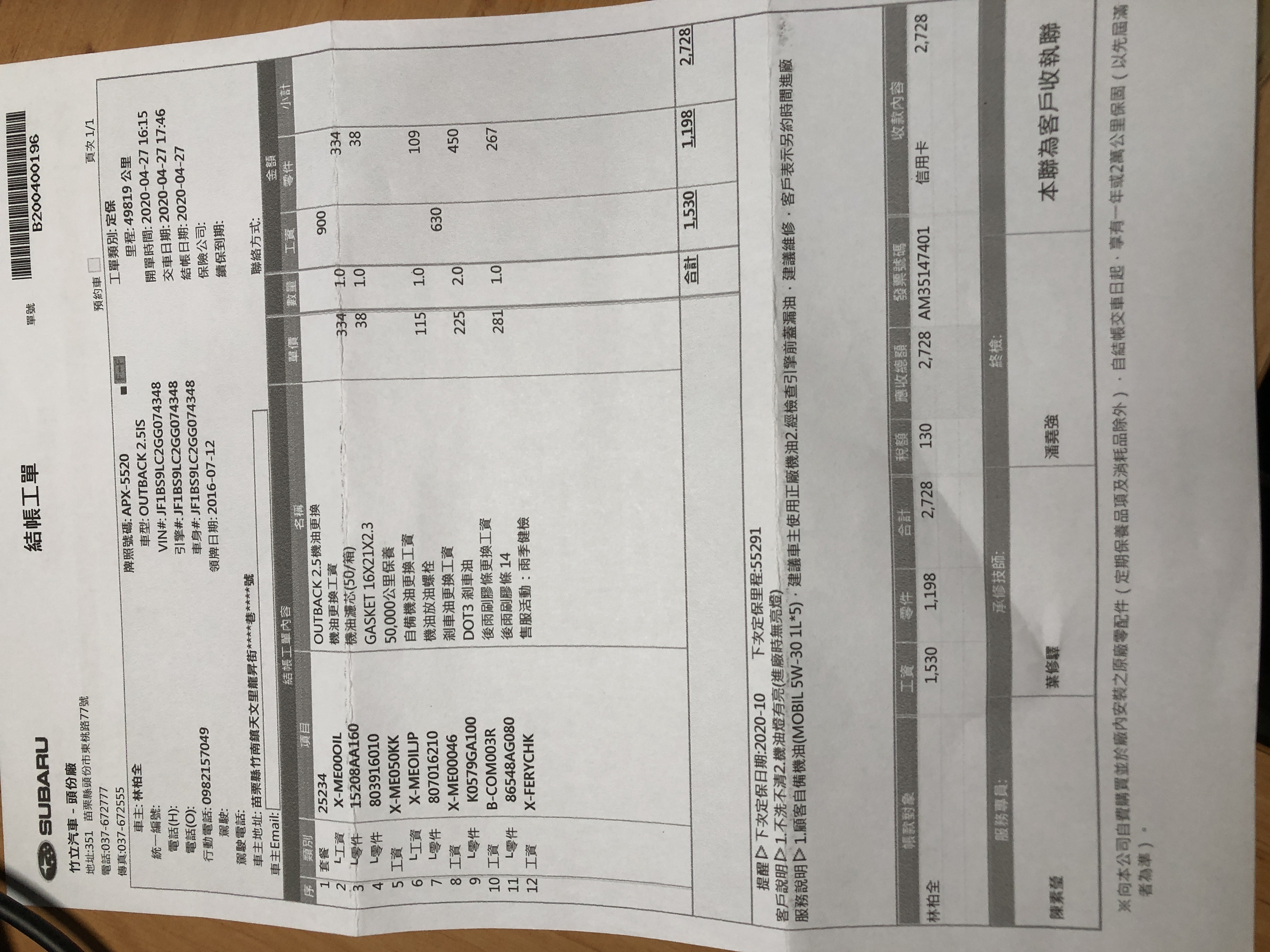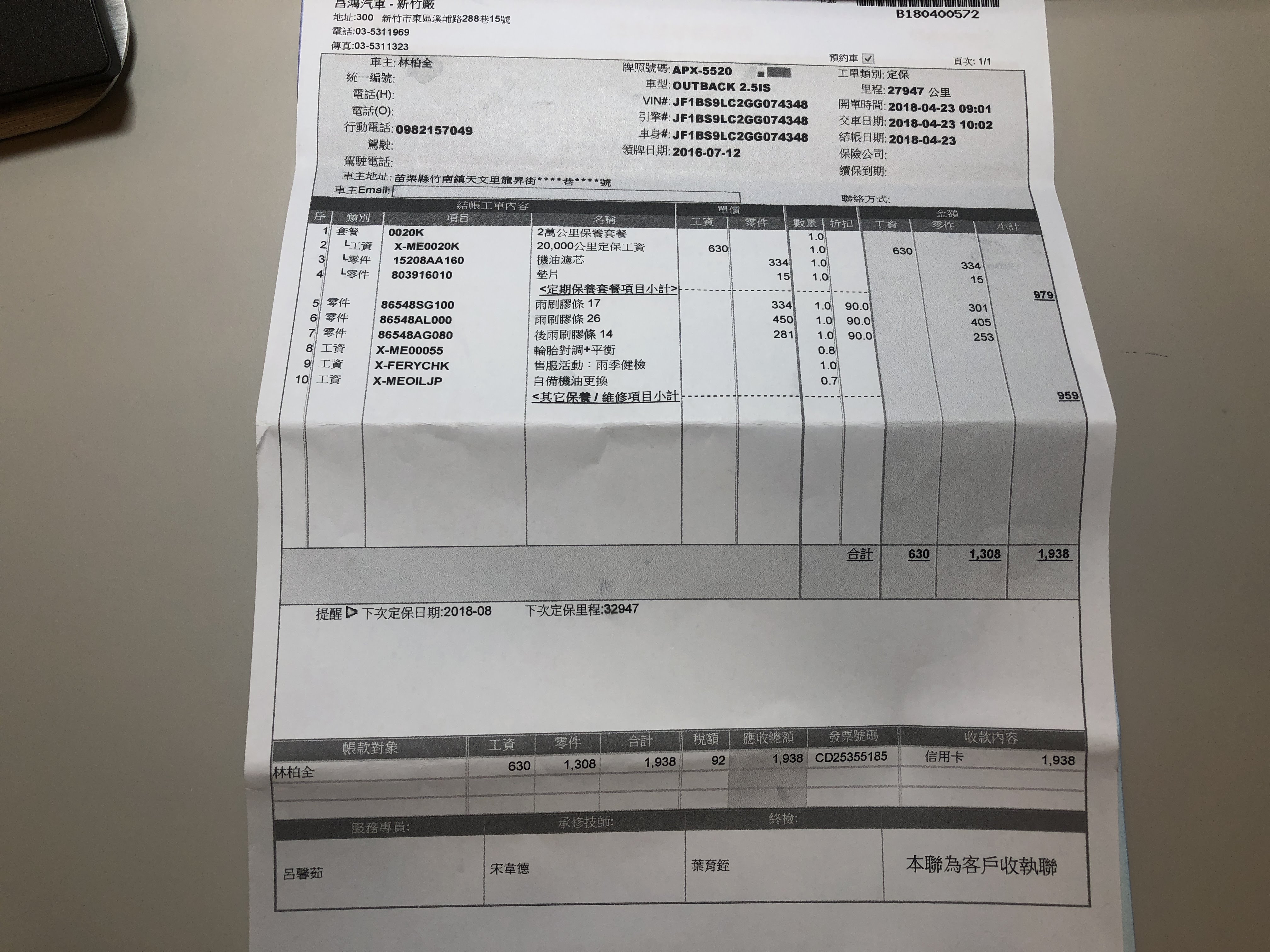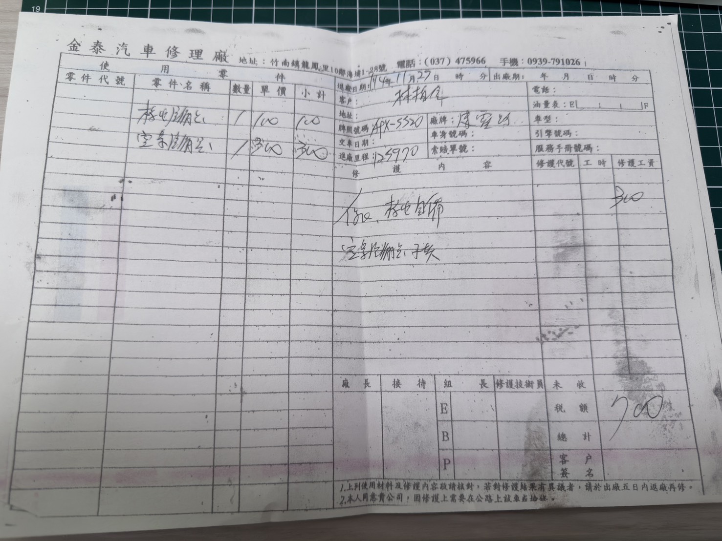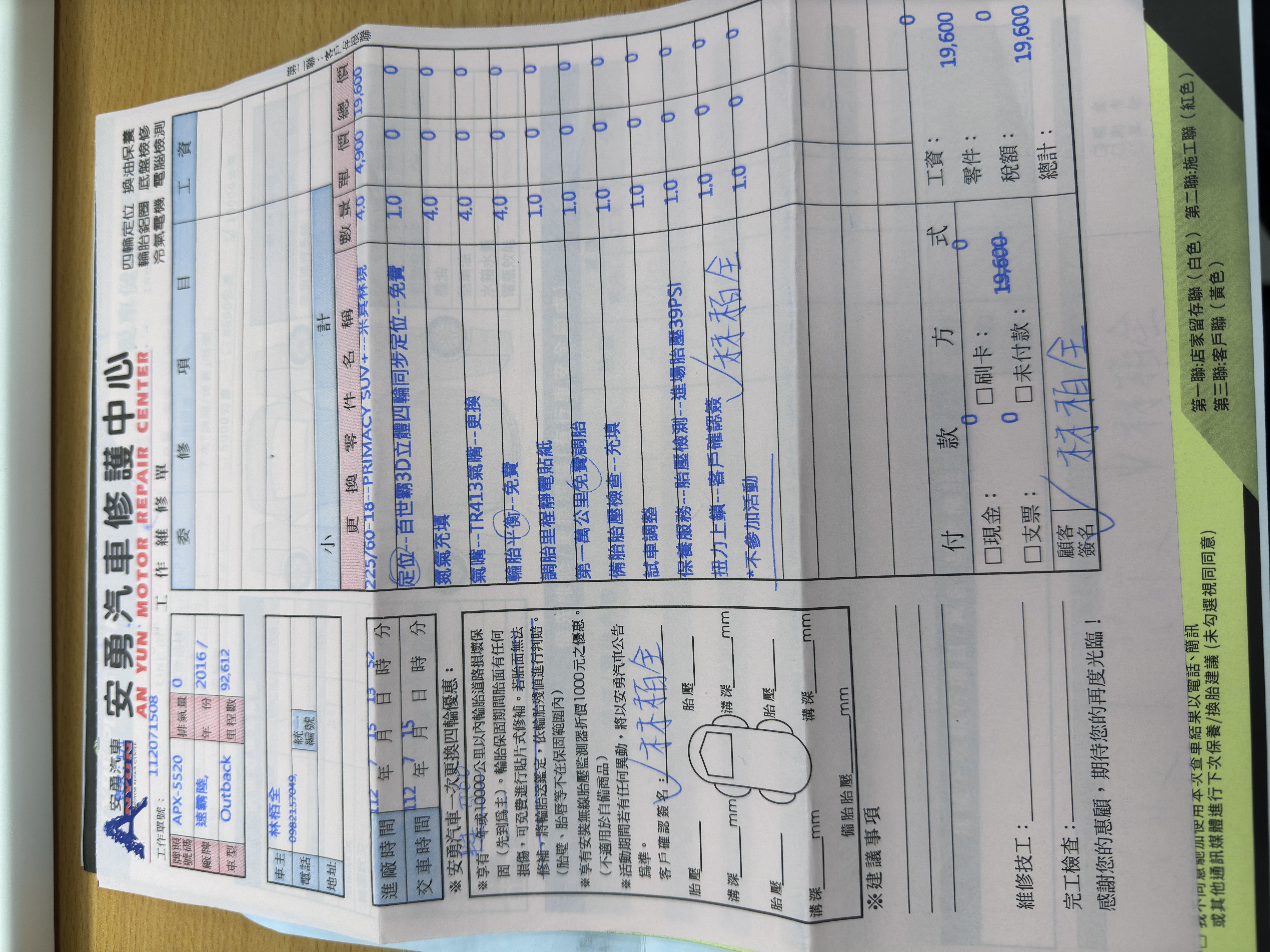 2018/4/20 進發輪胎更換 1. 煞車油 2. 調胎(交叉調) 1200元