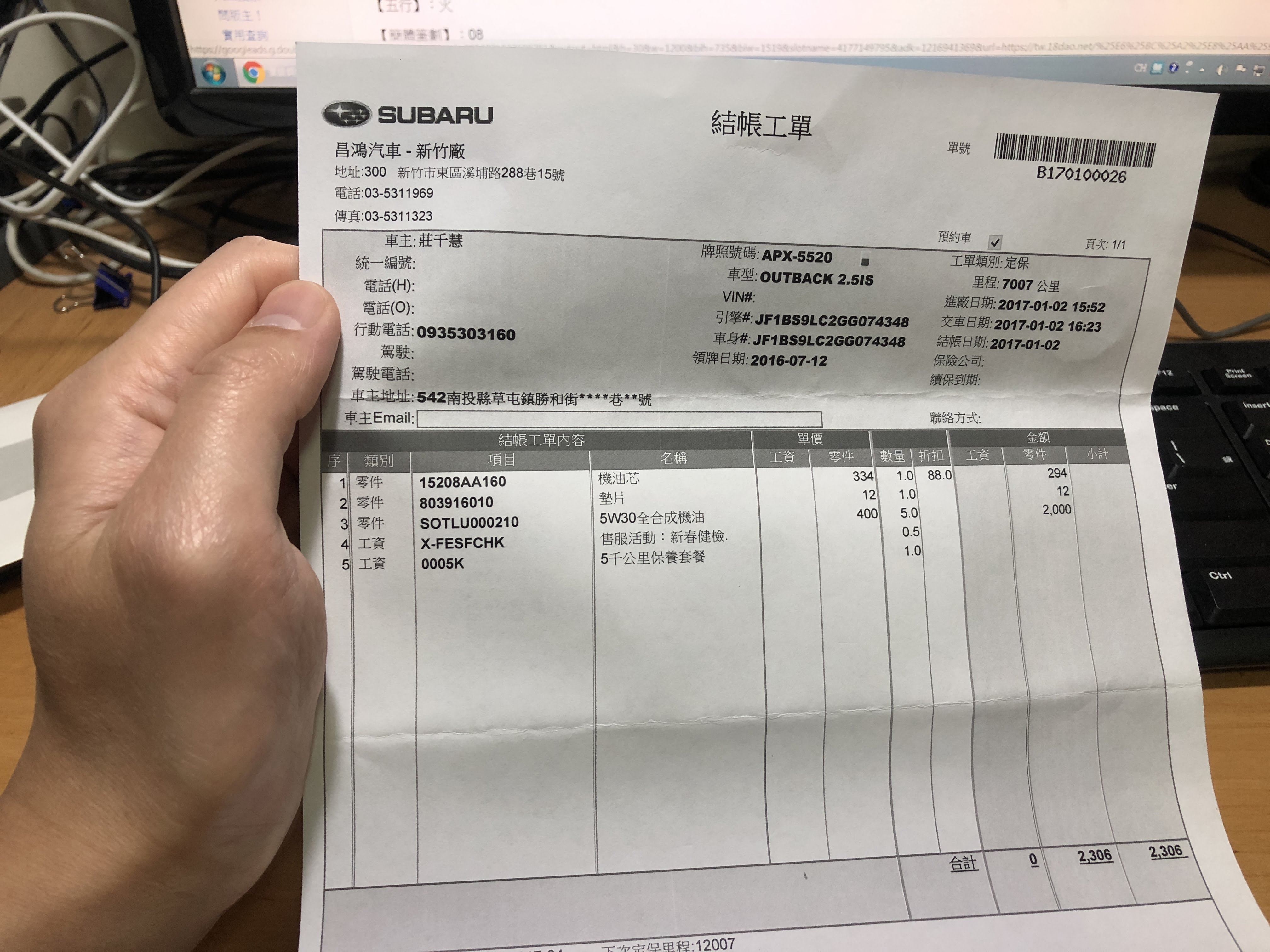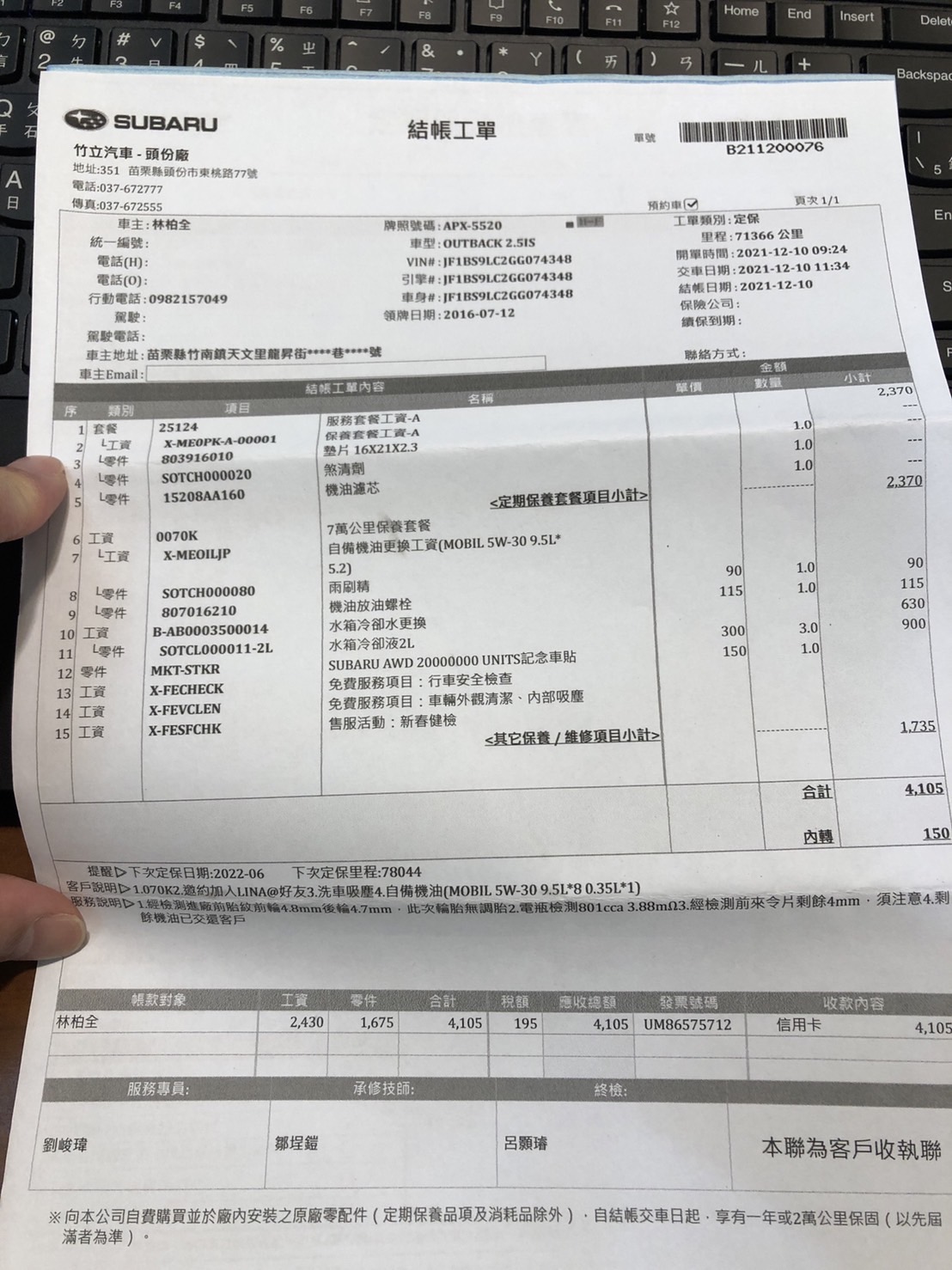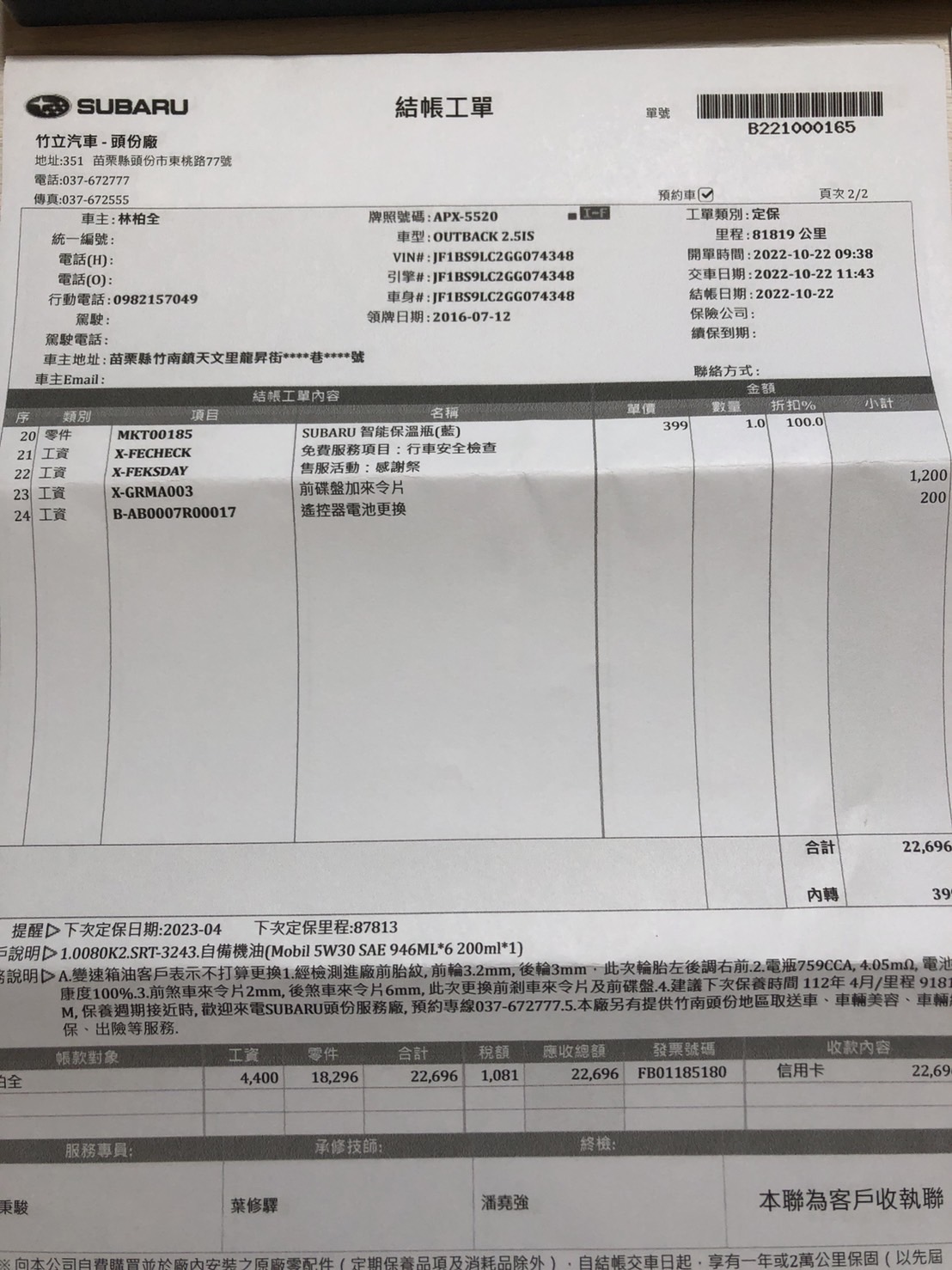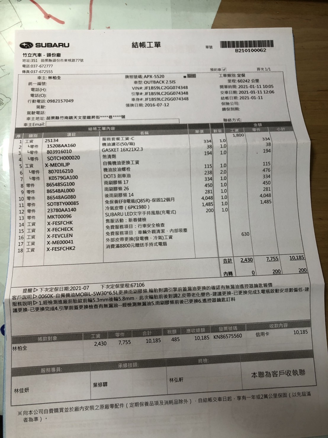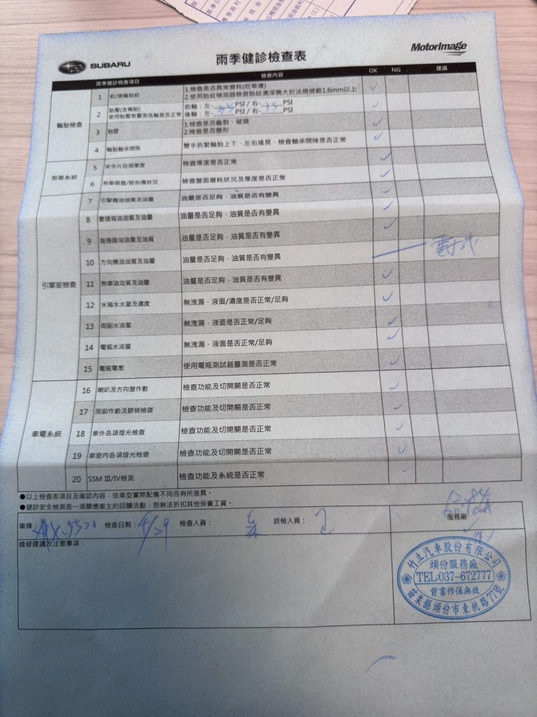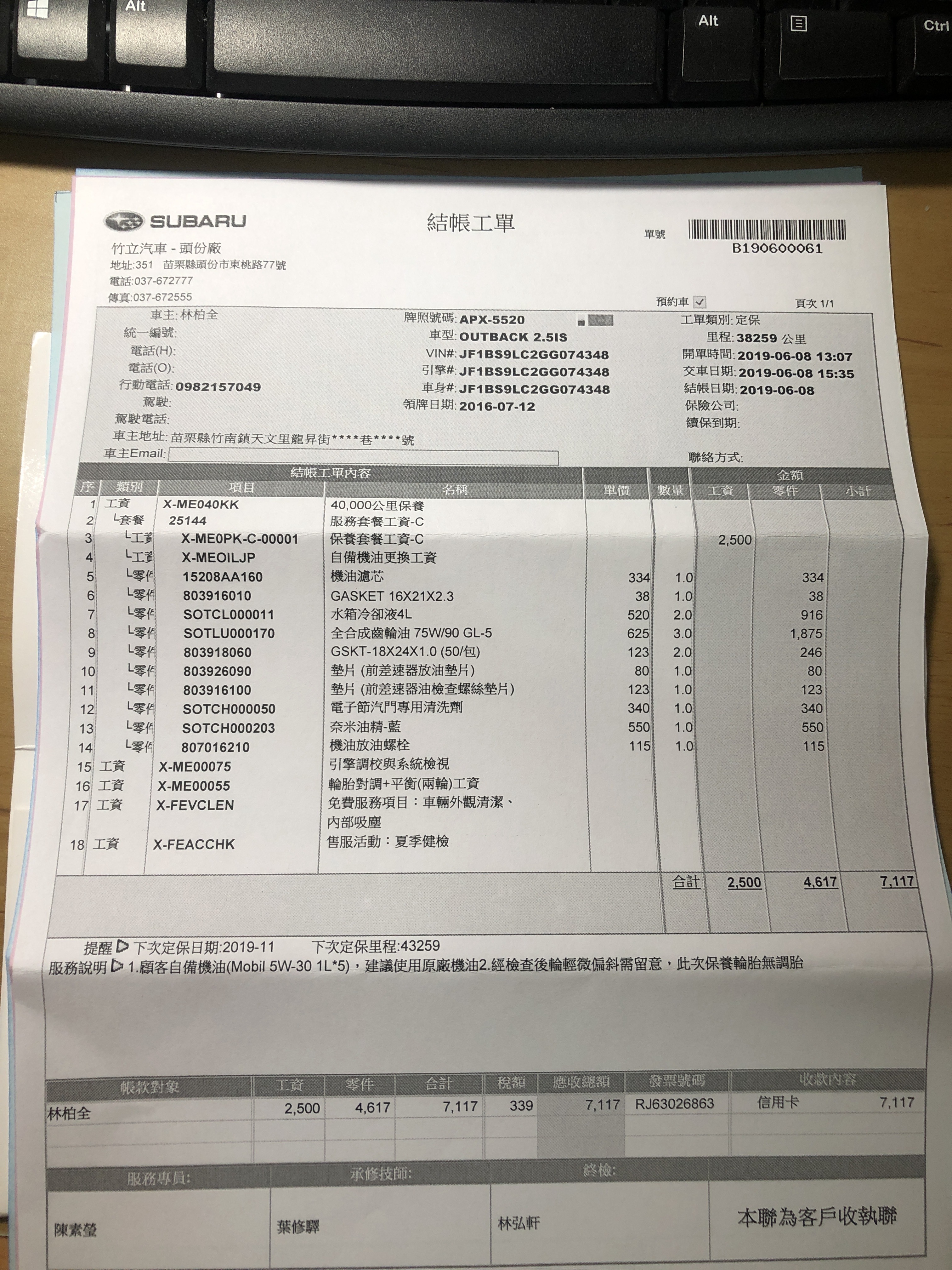 2018/4/20 進發輪胎更換 1. 煞車油 2. 調胎(交叉調) 1200元
